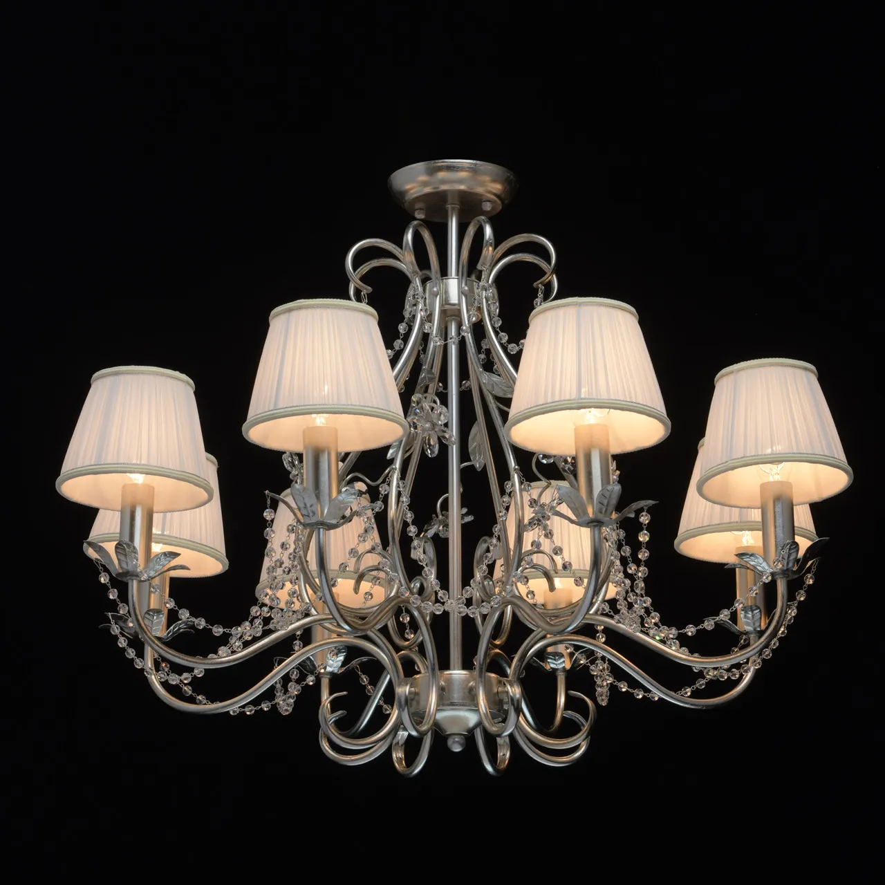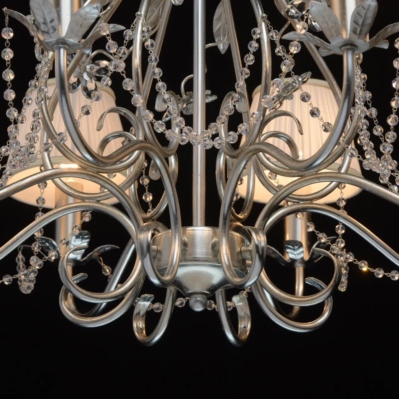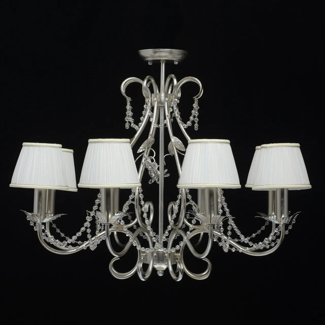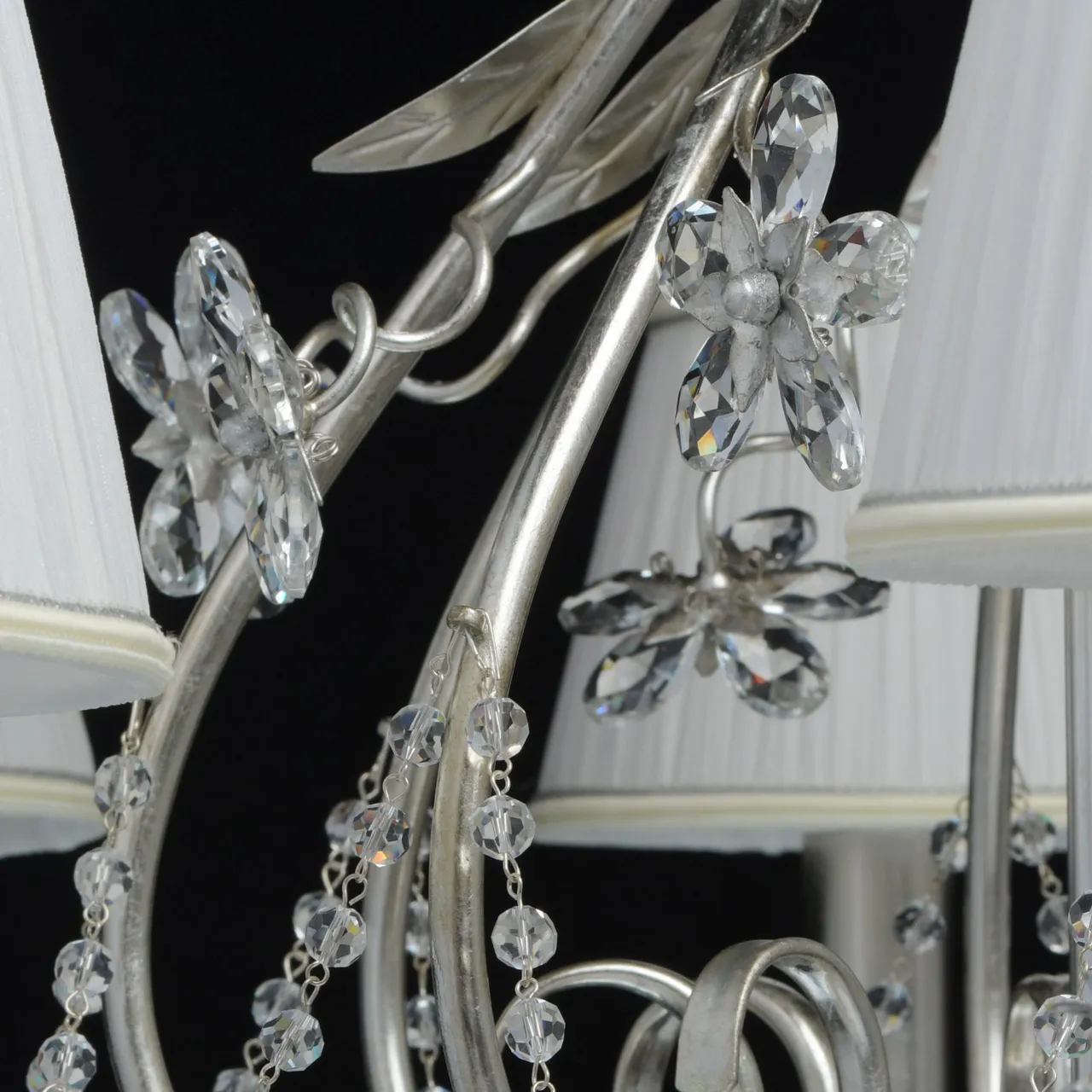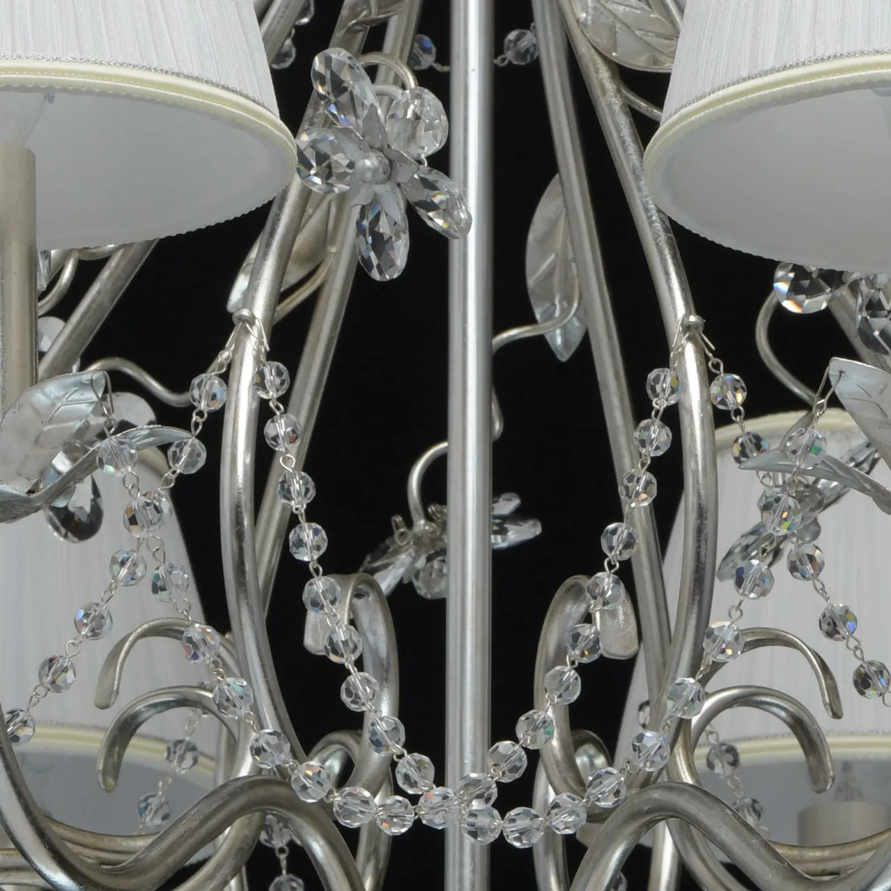 Металлическое основание покрыто сусальным серебром. Текстильные абажуры сливочного цвета. Декор -